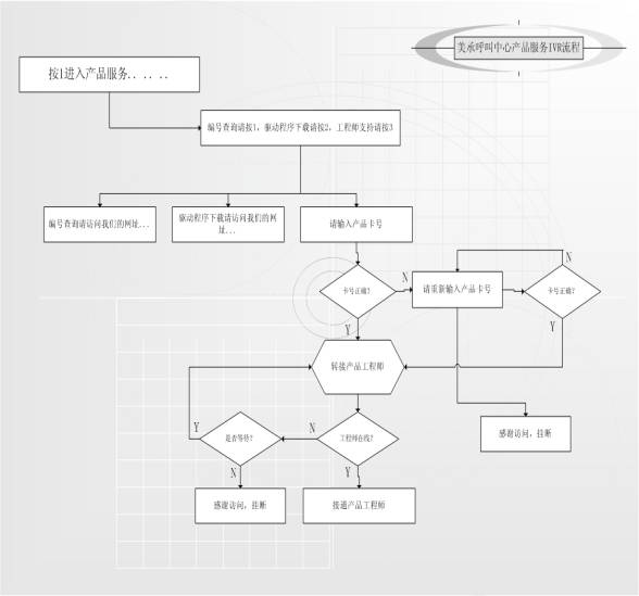 IVR系統(tǒng)是呼叫中心系統(tǒng)中極為重要的一環(huán)。作為面向用戶的窗口,IVR的語(yǔ)音交互方式引導(dǎo)用戶進(jìn)入不同的業(yè)務(wù)流程,聽取相關(guān)信息。清晰,流暢,禮貌而又有層次的IVR語(yǔ)音會(huì)給用戶留下深刻的印象。美承的IVR系統(tǒng)在設(shè)計(jì)上參照了其他成功的客服中心的經(jīng)驗(yàn),充分考慮了用戶的習(xí)慣,在流程上具有鮮明的特點(diǎn),以下以產(chǎn)品服務(wù)為例: