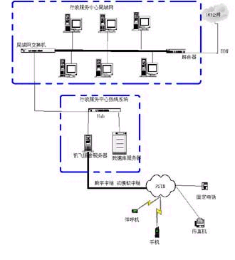 政府群眾一線通”系統(tǒng)可以通過局域網(wǎng)連入行政中心局域網(wǎng)交換機(jī),從而實(shí)現(xiàn)與整個行政服務(wù)中心的信息共享和熱線系統(tǒng)服務(wù)內(nèi)容的自動更新。具體網(wǎng)絡(luò)拓?fù)浣Y(jié)構(gòu)如下: