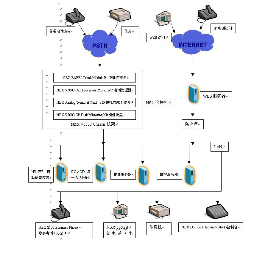 北京晨報的客戶服務(wù)中心項目是一個集呼叫中心與辦公系統(tǒng)于一體的語音、數(shù)據(jù)服務(wù)平臺。通過一條E1中繼線與外部電話網(wǎng)相聯(lián)。內(nèi)部使用50部數(shù)字電話進行處理辦公業(yè)務(wù),10個呼叫中心坐席采用計算機的軟電話(pcXset)實現(xiàn)與客戶的交談,傳真服務(wù)器通過NBX所提供的8條模擬內(nèi)線與外界互通。