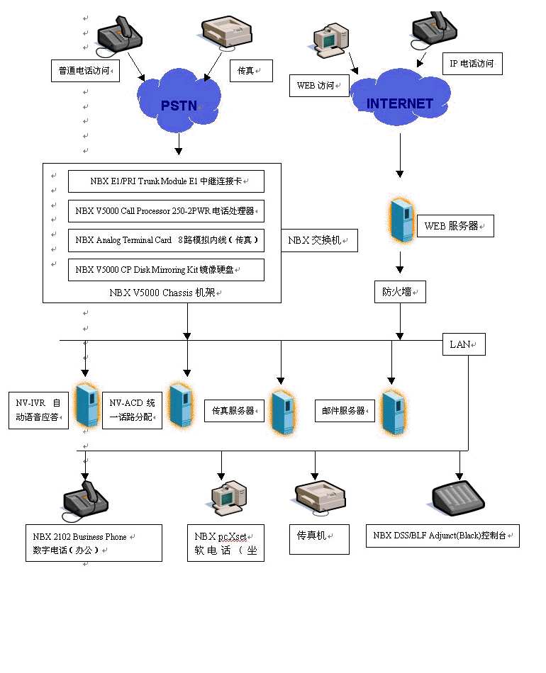 基于NBX的呼叫中心對外支持PSTN、IP兩種接入方式,可以實現(xiàn)各種接入:普通電話、傳真、IP電話、郵件、WEB訪問,NBX呼叫中心在技術(shù)上實現(xiàn)革命性的突破,在內(nèi)部實行語音數(shù)據(jù)兩網(wǎng)合一,將外部的模擬數(shù)據(jù)轉(zhuǎn)換為以太網(wǎng)數(shù)據(jù)包,由NV-ACD實現(xiàn)外部各種訪問的統(tǒng)一路由分配。
