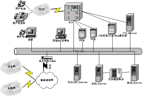 呼叫中心的功能主要有兩方面,一是與用戶進(jìn)行交互,另外與金融主機(jī)房進(jìn)行數(shù)據(jù)交互。呼叫中心系統(tǒng)由兩部分組成:聲訊平臺(CALL CENTER)和業(yè)務(wù)數(shù)據(jù)計算機(jī)網(wǎng)絡(luò)平臺。聲訊平臺由話務(wù)接入設(shè)備(ACD)、IVR系統(tǒng)和CTI服務(wù)器組成,主要負(fù)責(zé)語音資源的管理、呼入話務(wù)的排隊、自動業(yè)務(wù)以及人工座席的管理等;業(yè)務(wù)數(shù)據(jù)計算機(jī)網(wǎng)絡(luò)平臺是對業(yè)務(wù)數(shù)據(jù)的收集、使用、管理、分析等。平臺間通過CTI技術(shù)實現(xiàn)數(shù)字?jǐn)?shù)據(jù)和語音數(shù)據(jù)的相互轉(zhuǎn)換和同步轉(zhuǎn)移。系統(tǒng)結(jié)構(gòu)如下。