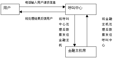 用戶通過撥打電話185連接到185客戶服務(wù)中 心,然后根據(jù)客戶服務(wù)中心的提示信息利用電話按鍵或語音輸入用戶的請求信息。用戶的請求信息傳送到呼叫中心后,呼叫中心會根據(jù)用戶的請求信息內(nèi)容進(jìn)行處理,如查詢儲蓄法規(guī)等,然后將處理結(jié)果反饋給用戶,如果牽涉到用戶的帳戶數(shù)據(jù),則呼叫中心將用戶的請求首先進(jìn)行處理,然后將處理后的信息發(fā)送給金融主機(jī)房,由金融主機(jī)根據(jù)呼叫中心傳來的數(shù)據(jù)進(jìn)行帳務(wù)處理,然后將處理結(jié)果返回給呼叫中心,呼叫中心再對金融主機(jī)房返回的數(shù)據(jù)進(jìn)行處理成客戶能夠聽到的語音信息,將處理結(jié)果傳給用戶。上述流程是一個單個處理流程,實際上跟用戶進(jìn)行交互時,一項業(yè)務(wù)會有多個往返的處理流程。