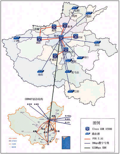 河南省教育科研計(jì)算機(jī)網(wǎng)(HERNET)作為中國(guó)教育科研計(jì)算機(jī)網(wǎng)絡(luò)(CERNET)在河南的省級(jí)網(wǎng)絡(luò),提供河南省的教育與科研機(jī)構(gòu)的Internet接入。在CERNET業(yè)已發(fā)展成為中國(guó)第二大互聯(lián)網(wǎng)的今天,各省教研網(wǎng)的建設(shè)變得尤為重要,河南省在2001年啟動(dòng)“教育信息化年”規(guī)劃后,多方合作,采用思科系統(tǒng)(中國(guó))網(wǎng)絡(luò)技術(shù)有限公司的高端網(wǎng)絡(luò)設(shè)備,將原來骨干帶寬僅為2M的教育科研網(wǎng)升級(jí)到2.5G,順利實(shí)現(xiàn)了教育科研網(wǎng)絡(luò)應(yīng)用的飛躍性進(jìn)步,并且真正實(shí)現(xiàn)了“三網(wǎng)合一”。