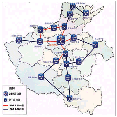 HERNET一期工程主干網(wǎng)采用IP POS技術(shù),應(yīng)用AVVID網(wǎng)絡(luò)體系結(jié)構(gòu),采用骨干傳輸網(wǎng)、城域網(wǎng)、接入網(wǎng)三層設(shè)計(jì)方案,以省網(wǎng)絡(luò)中心(設(shè)在鄭州大學(xué)網(wǎng)絡(luò)中心)、地市網(wǎng)絡(luò)中心、校園網(wǎng)三級(jí)管理模式。由省網(wǎng)絡(luò)中心向下以2.5G速度連接到各地市網(wǎng)絡(luò)中心,而向上則以155M速度連接到CERNET及Internet。整個(gè)一期工程實(shí)現(xiàn)了包括鄭州、許昌、平頂山、開封、洛陽、濟(jì)源、焦作以及新鄉(xiāng)等7個(gè)地市的2.5G連接,并形成了一個(gè)環(huán)網(wǎng)狀冗余拓?fù)浣Y(jié)構(gòu),確保當(dāng)網(wǎng)絡(luò)的一個(gè)節(jié)點(diǎn)出現(xiàn)問題時(shí),數(shù)據(jù)可以通過其他途徑傳輸?shù)侥康牡,在一期工程完成后,?0多所大學(xué)、中小學(xué)等教育與科研單位以千兆速度連接到HERNET上,共有近50萬的用戶能夠充分利用高速帶寬獲得教育網(wǎng)資源。