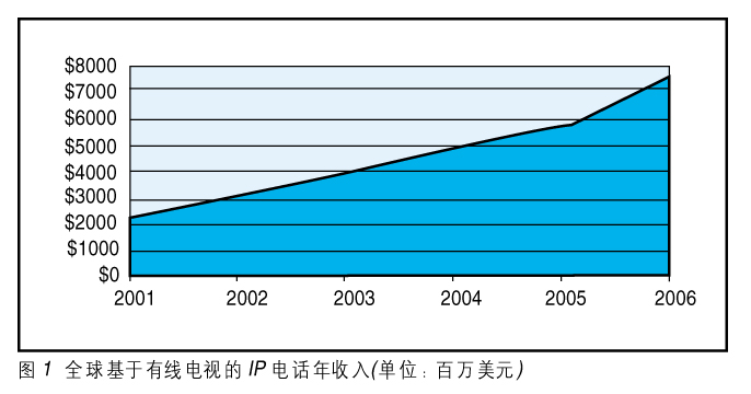 有線電視運(yùn)營(yíng)商在尋找使用有線電視基礎(chǔ)網(wǎng)絡(luò)HFC的新服務(wù),創(chuàng)造新的經(jīng)濟(jì)增長(zhǎng)點(diǎn),提供數(shù)據(jù)、語(yǔ)音、圖像綜合的服務(wù)。基于有線電視系統(tǒng)的IP電話將是第一個(gè)最有可能推出的新服務(wù)。2002年InStat/MDR的分析報(bào)告說(shuō)2006年基于有線電視的IP電話網(wǎng)將達(dá)到US$75億的年收入,如圖1所示。
