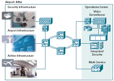 。。許多機(jī)場(chǎng)安全系統(tǒng)基于需人工協(xié)調(diào)提示和報(bào)警的不兼容應(yīng)用。通過(guò)在網(wǎng)絡(luò)上實(shí)現(xiàn)這些系統(tǒng)和在基于標(biāo)準(zhǔn)的通用基礎(chǔ)設(shè)施上傳輸信息,機(jī)場(chǎng)可實(shí)時(shí)關(guān)聯(lián)安全信息,并根據(jù)整體形勢(shì)作出立即行動(dòng)。思科提供了一個(gè)強(qiáng)大的網(wǎng)絡(luò)基礎(chǔ)設(shè)施,可集成機(jī)場(chǎng)中的視頻監(jiān)視、其它物理安全設(shè)備和用于緊急響應(yīng)及通信的設(shè)備。無(wú)論設(shè)備使用有線還是無(wú)線連接,都可在所有類(lèi)型的設(shè)備上實(shí)現(xiàn)語(yǔ)音、視頻和數(shù)據(jù)交換。