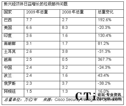 幾個世界經(jīng)濟領(lǐng)先的國家在2008年和2009年間垃圾郵件量有所降低;然而,發(fā)展中國家的垃圾郵件量呈現(xiàn)上升趨勢。