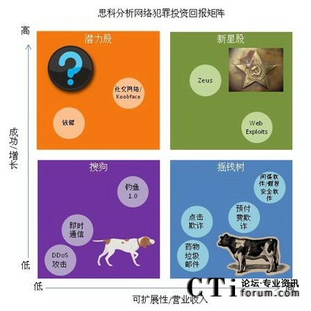 思科網(wǎng)絡(luò)犯罪投資回報(CROI)矩陣:今年的《年度安全報告》首次推出了思科CROI矩陣,以波士頓咨詢集團著名的“增長-份額矩陣”為基礎(chǔ)。CROI分析了2010年何種類型的網(wǎng)絡(luò)犯罪將為成為“成功者”以及“失敗者”。該矩陣根據(jù)2009年的表現(xiàn),預(yù)測大量的銀行業(yè)Trojan