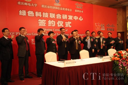重慶市副市長童小平與思科公司全球副總裁林正剛出席簽約儀式,并共同為“綠色科技聯(lián)合研究實驗室”揭牌。儀式由重慶市政府人員副秘書長廖慶軒主持,重慶市經(jīng)濟(jì)與信息化委員會黨組書記沐華平副主任作為見證人,與重慶郵電大學(xué)校長陳流汀教授、思科中國研發(fā)中心總經(jīng)理常詢傳博士共同在協(xié)議書上簽字,思科公司和市級相關(guān)部門負(fù)責(zé)人參加了簽約儀式。