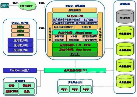 AIOpenCRM的底層技術(shù)框架不僅僅可以使用AIAppFrame提供的各種工具,而且可以使用第三方的應(yīng)用中間件產(chǎn)品,如工作流方面使用Bea的WLI或者IBM的MQ WorkFlow。