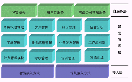 SP統(tǒng)一管理系統(tǒng)從功能邏輯上劃分,我們歸納為三大功能層來對系統(tǒng)進(jìn)行總體的介紹:接入層、運營管理層、自服務(wù)層。如下圖所示: