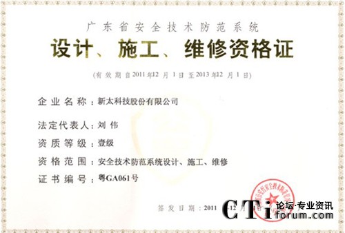 CTI論壇(ctiforum)1月31日消息(記者 浩宇):近日,新太科技股份有限公司再傳喜訊,公司順利通過廣東省公安廳認定的“廣東省安全技術(shù)防范系統(tǒng)設(shè)計、施工、維修一級資格證”換證審核,成功獲得新證書。此次新太科技資質(zhì)認證的通過,是新太科技公司全體員工通過兩年的不斷努力得到的豐碩成果,她不僅體現(xiàn)了新太科技安防技術(shù)等級在行業(yè)內(nèi)處于領(lǐng)先的優(yōu)勢,同時也體現(xiàn)出新太科技的管理和服務水平實現(xiàn)了行業(yè)內(nèi)的完美延續(xù)。CTI論壇報道