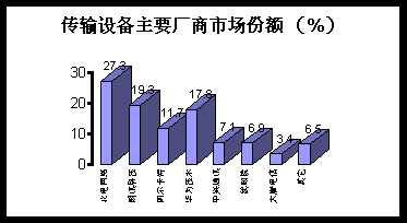 (3)市場發(fā)展及預(yù)測:2001年城域網(wǎng)絡(luò)、接入網(wǎng)絡(luò)等光網(wǎng)絡(luò)建設(shè)的加速,將推動(dòng)傳輸設(shè)備市場保持25%以上的增長。 更多的非外資廠商預(yù)計(jì)在高端傳輸設(shè)備領(lǐng)域取得突破,相關(guān)設(shè)備價(jià)格可能同比降低12%以上。傳統(tǒng)傳輸設(shè)備市場加速萎縮、DWDM等光傳輸技術(shù)與設(shè)備將成為市場中的壟斷力量。