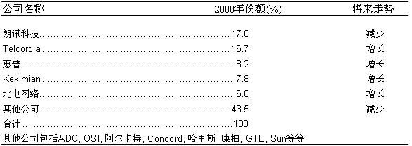 從目前市場(chǎng)情況來(lái)看,美國(guó)的固定網(wǎng)OSS服務(wù)保障的市場(chǎng)集中度相當(dāng)高。在市場(chǎng)中領(lǐng)先的公司一共有5家,它們分別是朗訊科技、Telcordia科技、惠普公司、Hekimian和北電網(wǎng)絡(luò)。這五家公司均是較早進(jìn)入這一市場(chǎng)的老牌公司。2000年,它們?cè)诠潭ňW(wǎng)OSS服務(wù)保障領(lǐng)域的銷(xiāo)售額總和為8.60億美元,約占整個(gè)市場(chǎng)的56.5%左右,另外43.5%的市場(chǎng)被約其他二十多家廠(chǎng)商分割。