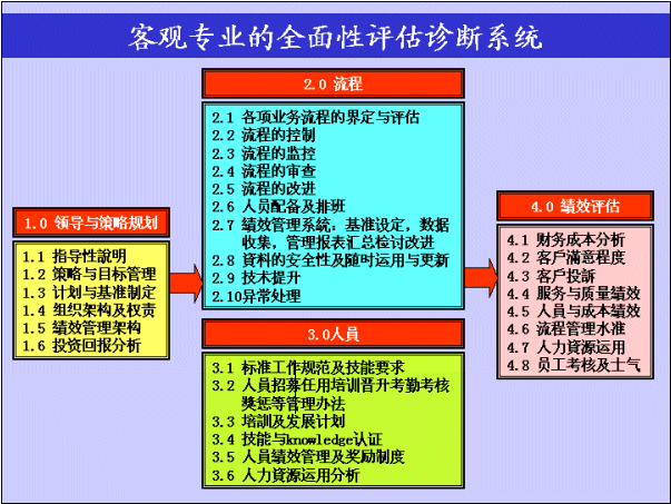此評估診斷系統(tǒng)以1.0領(lǐng)導(dǎo)與決策規(guī)劃為起始點(diǎn),作為建立一個(gè)以客戶為核心的高質(zhì)量客戶服務(wù)中心的推動(dòng)根源,并且制定了一個(gè)良好的4.0績效評估系統(tǒng),以確保經(jīng)營目標(biāo)與標(biāo)準(zhǔn)質(zhì)量基準(zhǔn)能確實(shí)達(dá)成,此過程需透過嚴(yán)謹(jǐn)?shù)牧鞒淘O(shè)計(jì)和高效的人員管理去執(zhí)行這套運(yùn)營體系。