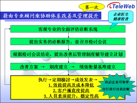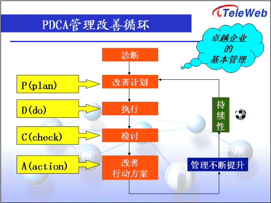 2) PDCA的流程,即診斷、改善計(jì)劃、執(zhí)行、檢討以及改善行動(dòng)方案等。