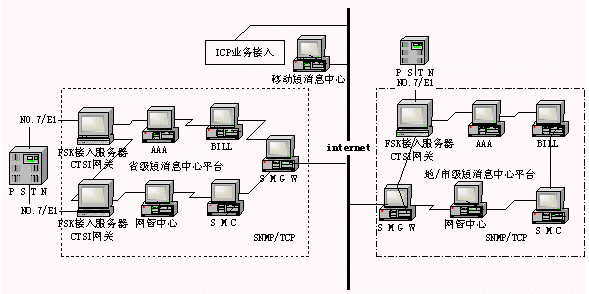 全國短消息統(tǒng)一平臺是在省局短消息中心上架構(gòu),各省局下設(shè)地/市局短消息中心。各地短消息中心通過INTERNET連接,交互信息,ICP業(yè)務(wù)商和其他業(yè)務(wù)平臺也通過INTERNET接入短消息系統(tǒng)。根據(jù)《基于電話網(wǎng)的信息終端及綜合平臺技術(shù)規(guī)范》中的CTSI (Chinese Terminal Service Interface)協(xié)議,短消息系統(tǒng)系統(tǒng)結(jié)構(gòu)可如下圖所示: