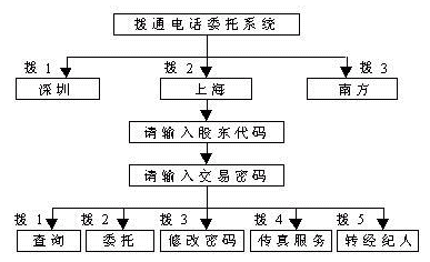 通過該項服務(wù),股民可以在任何地點使用任何一部雙音頻電話方便的向證券公司發(fā)出買入、賣出等各種委托指令,也可以發(fā)出查詢指令,證券公司的電話委托交易系統(tǒng)根據(jù)股民的指令自動完成委托及查詢操作,將結(jié)果反饋給股民。股民發(fā)給證券公司的信息,主要為數(shù)碼、數(shù)字,通過雙音頻電話按鍵來傳送。證券公司電話委托交易系統(tǒng)發(fā)給股民的信息,則是用語音傳送的操作及查詢結(jié)果。通過功能擴充,還可提供其它配套服務(wù),如將查詢結(jié)果發(fā)送至股民的傳真機。若股民利用計算機接至委托公司,還可享受可視委托等更為多樣的服務(wù)。