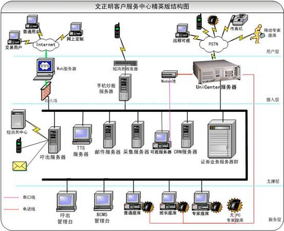 泰陽(yáng)證券有客戶(hù)2萬(wàn)多,相當(dāng)一部分要通過(guò)電話(huà)委托程序作交易。原有電話(huà)委托系統(tǒng)是模擬線(xiàn)。交易忙時(shí),很多股民打不進(jìn)去。以前的業(yè)務(wù)相對(duì)也比較簡(jiǎn)單。文正明公司在了解了泰陽(yáng)方面的業(yè)務(wù)需要后,用公司的UniCenter系統(tǒng)和深圳東進(jìn)公司的ISDN數(shù)字卡、傳真卡和座席卡,為泰陽(yáng)搭建了一個(gè)新的語(yǔ)音應(yīng)用平臺(tái)。