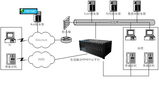 to Talk)”發(fā)展到“點(diǎn)擊到交談(Click to Talk)”,通過Internet可以提供IP電話語音呼叫、Call Back、IP傳真、IM、E-mail等功能,擴(kuò)展了通信渠道,一方面用戶可以實(shí)現(xiàn)免費(fèi)接入到呼叫中心,另一方面企業(yè)能夠向更多的客戶提供優(yōu)質(zhì)、方便的服務(wù)資源,而且由于這些資源的價格相對傳統(tǒng)通信便宜,使企業(yè)為客戶提供全國、乃至于全球服務(wù)成為可能,提高了企業(yè)客戶服務(wù)水平,增強(qiáng)了企業(yè)競爭力。東進(jìn)互聯(lián)網(wǎng)呼叫中心系統(tǒng)結(jié)構(gòu)如圖所示: