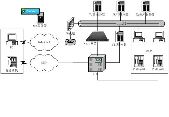 當(dāng)客戶訪問企業(yè)網(wǎng)站,需要與企業(yè)客戶服務(wù)人員語音交流時,點(diǎn)擊“Call me”按鈕,如果客戶是第一次使用此功能,客戶終端會自動下載一個服務(wù)程序(對于Skype方式,會自動下載Skype軟件),并啟動服務(wù)窗口,用戶通過此窗口即可與呼叫中心進(jìn)行交互,座席也將從服務(wù)器下載一個服務(wù)程序和用戶進(jìn)行交互,并可通過互聯(lián)網(wǎng)實(shí)現(xiàn)遠(yuǎn)程座席。
