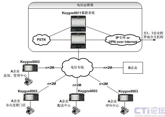 利用東進Keygoe系列多媒體交換機的多網(wǎng)絡融合性能通過電信優(yōu)質的IP專網(wǎng)將位于不同省市的通信外包大平臺連接起來,實現(xiàn)異地平臺的IP互聯(lián),建立跨區(qū)域的分布式的統(tǒng)一大平臺,為連鎖企業(yè)提供全國和全省統(tǒng)一電話號碼和其他的跨地區(qū)應用提供了基礎。