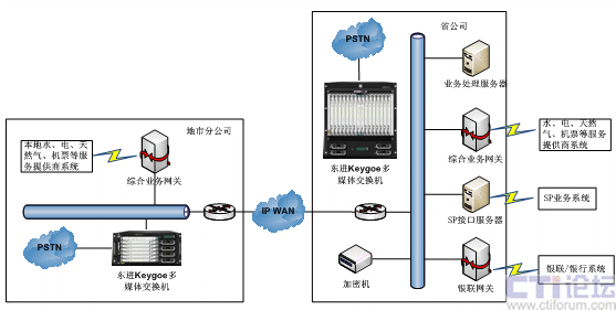 東進(jìn)固網(wǎng)支付平臺(tái)通過(guò)IP專(zhuān)網(wǎng)將省公司和各地市公司的系統(tǒng)連接起來(lái),采取二級(jí)地市分公司數(shù)據(jù)接入、運(yùn)營(yíng)商總部集中處理的拓?fù)浼軜?gòu),實(shí)現(xiàn)業(yè)務(wù)的全省統(tǒng)一運(yùn)營(yíng)。各地市公司分別建設(shè)一套接入平臺(tái),業(yè)務(wù)處理服務(wù)器統(tǒng)一建設(shè)在運(yùn)營(yíng)商總部。各地市的水、電、煤氣、電信、彩票等外部系統(tǒng)通過(guò)在本地建設(shè)的綜合業(yè)務(wù)網(wǎng)關(guān)與業(yè)務(wù)系統(tǒng)對(duì)接,支付業(yè)務(wù)統(tǒng)一通過(guò)運(yùn)營(yíng)商總部所在地銀聯(lián)轉(zhuǎn)到各地銀聯(lián)進(jìn)行。