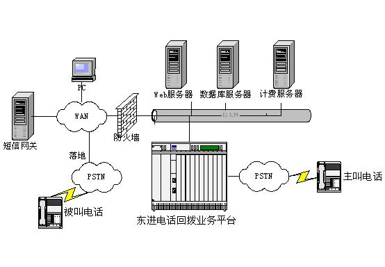 東進回撥業(yè)務平臺利用主叫收費和被叫收費的差異,通過軟交換技術的靈活性和開放性,實現呼叫流程上的變化,用網絡傳遞語音數據包,再將信號接入一些租用的公共電信網絡實現通話功能,運營商或者虛擬運營商通過收取資費,從而打到用戶節(jié)省通話資費的目的。系統(tǒng)的拓撲圖如下所示。