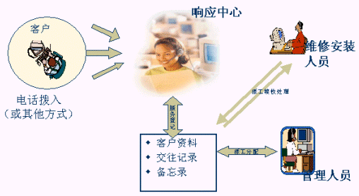 談起客戶服務(wù)部門的流程管理,我想許多有過這方面經(jīng)驗的人可能會覺得頭大,因為它涉及環(huán)節(jié)多,如派工、配件管理、人員管理、總部對分公司的管理等等。因此,在服務(wù)管理系統(tǒng)中,就提供了一種自動化的流程管理,涵概了服務(wù)部門的所有業(yè)務(wù)應(yīng)用,包含了客戶響應(yīng)處理、服務(wù)派工管理、配件管理、員工管理以及總部對分公司的管理等,迅速構(gòu)架公司總部與各地分公司溝通渠道,解決總部與分公司信息流轉(zhuǎn)的問題。下圖反應(yīng)了服務(wù)流程管理過程。