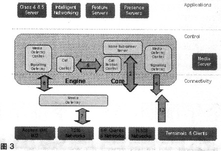 連接層由3個(gè)關(guān)鍵部分組成:用戶(hù)設(shè)備、媒體網(wǎng)關(guān)和IP傳輸。ENGINE解決方案的媒體網(wǎng)關(guān)可以支持從很小數(shù)量的用戶(hù)擴(kuò)展到數(shù)百萬(wàn)用戶(hù)。本地交換機(jī)、匯接交換機(jī)和用戶(hù)交換機(jī)可以接入到媒體網(wǎng)關(guān)。多媒體用戶(hù)可通過(guò)SIP終端和IAD接入。ENGINE支持采用V5、ISUP、SIP和H.248等各種接入節(jié)點(diǎn)的用戶(hù)。在ENGINE解決方案中,媒體網(wǎng)關(guān)同時(shí)也是接入網(wǎng)關(guān),可以實(shí)現(xiàn)C5電話(huà)業(yè)務(wù)和基于SIP的寬帶用戶(hù)功能。