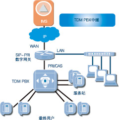 眾多企業(yè)隨著業(yè)務的擴張,開設了大量的分支機構,企業(yè)總部以及分支機構之間的語音溝通非常頻繁,企業(yè)長途電話費用是企業(yè)經營成本中的一項巨大開支。現(xiàn)階段,多數(shù)的企業(yè)客戶,包括大型和中、小型企業(yè)基本上都采用PBX作為企業(yè)內部的通信方式,該方案有天然的優(yōu)越性,如短號互撥、電腦話務員、DID等功能,但也有弊端:占用機房面積大、維護困難并且不能解決異地長途通話問題。隨著科技的發(fā)展和寬帶接入的普及,幾乎每個企業(yè)及其分支機構都有互聯(lián)網(wǎng)接入,因此借助現(xiàn)有互聯(lián)網(wǎng),節(jié)約長途電話成本,日漸成為公司的重要選擇。端到端的多媒體通信和辦公系統(tǒng)的有機結合成為更多新型企業(yè)的期待。圖1 TDM PBX Trunking 接入方案