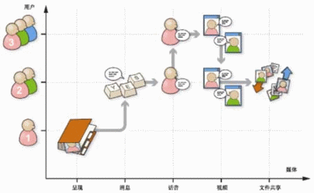 如圖1所示,用戶首先打開基于呈現(xiàn)業(yè)務(wù)的地址簿,向其好友發(fā)送一條消息,然后向該好友發(fā)起一個話音呼叫,在通話過程中又添加一個新的對象,隨后在這個多方通話中又添加了視頻業(yè)務(wù),接下來又去除一個對象,多方通話恢復(fù)為雙方通話,最后使用了文件共享業(yè)務(wù)。所有這些多媒體業(yè)務(wù)都是由用戶的一個SIP會話控制和激活的。