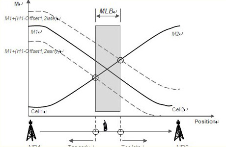 過(guò)早、過(guò)晚切換是由于目標(biāo)小區(qū)切換門(mén)限過(guò)低和過(guò)高所致。對(duì)應(yīng)過(guò)早和過(guò)晚臨界切換門(mén)限之間的區(qū)間就是合理的移動(dòng)性優(yōu)化范圍。頻內(nèi)的負(fù)載均衡也可以通過(guò)調(diào)整切換門(mén)限值來(lái)引導(dǎo)用戶和負(fù)荷由高負(fù)荷小區(qū)遷移至低負(fù)荷小區(qū),很顯然可調(diào)的門(mén)限區(qū)間就是移動(dòng)性優(yōu)化允許的范圍。這個(gè)范圍對(duì)應(yīng)相鄰小區(qū)的重覆蓋面積,在LTE中理論上大概相當(dāng)于正常小區(qū)面積的15%,可操作的價(jià)值不是很大。愛(ài)立信更傾向于異頻或者異系統(tǒng)的負(fù)荷均衡方案,增益比較明顯。如下圖,一個(gè)終端從左至右移動(dòng),M1、M2分別是接收到eNB1和eNB2的信號(hào)強(qiáng)度曲線,兩條曲線相交點(diǎn)對(duì)應(yīng)的地理位置處終端接收到的信號(hào)強(qiáng)度相同,對(duì)cell1到cell2的切換,下面的虛線對(duì)應(yīng)過(guò)早切換臨界,上面的虛線對(duì)應(yīng)過(guò)晚切換臨界,兩線與M2相交點(diǎn)對(duì)應(yīng)合理切換門(mén)限區(qū)間,也是頻內(nèi)負(fù)載均衡MLB的可調(diào)范圍。