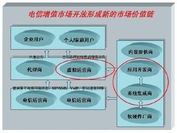 在電信增值市場(chǎng)開放的背景之下,新的市場(chǎng)價(jià)值鏈正在形成(如圖所示)。國(guó)內(nèi)電信建設(shè)轟轟烈烈的大規(guī);A(chǔ)設(shè)施投資已是明日黃花,改善應(yīng)用“稀缺”的現(xiàn)狀才是當(dāng)務(wù)之急。李峻認(rèn)為,信息產(chǎn)品技術(shù)服務(wù)提供商最主要的任務(wù),就是幫助運(yùn)營(yíng)商開發(fā)針對(duì)中國(guó)市場(chǎng)的增值業(yè)務(wù),并帶動(dòng)其主業(yè)協(xié)同發(fā)展。即面向電信網(wǎng)絡(luò)運(yùn)營(yíng)商以及虛擬運(yùn)營(yíng)商,提供增值業(yè)務(wù)系統(tǒng)整體解決方案及其軟硬件支撐平臺(tái)和應(yīng)用系統(tǒng)。
