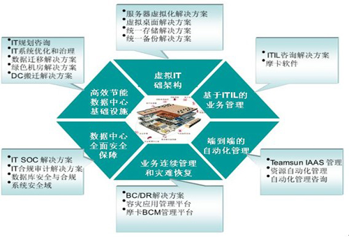 圍繞云計(jì)算數(shù)據(jù)中心的建設(shè),華勝天成共開發(fā)了多個(gè)解決方案,且每個(gè)解決方案均有專業(yè)的售前支持團(tuán)隊(duì)和售后實(shí)施團(tuán)隊(duì),這些解決方案不是分散而無(wú)關(guān)的,而是針對(duì)用戶的不同情況,在各方面均給予綜合考慮,以最優(yōu)的設(shè)計(jì)方案來滿足用戶的需要,并兼顧另外方面的后繼需求。