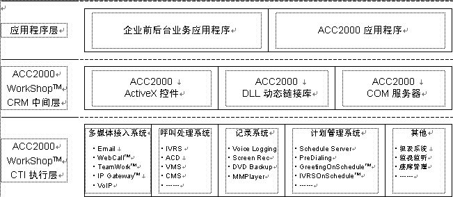 ACC2000 Workshop是聲訊科技集團(tuán)為基于Microsoft Windows操作系統(tǒng)的CRM應(yīng)用軟件開發(fā)所建立的開發(fā)平臺(tái)(中間件)。以ACC2000 Workshop為基礎(chǔ)的ACC2000集成多媒體溝通中心采用三層結(jié)構(gòu),利用ACC2000 Workshop的CRM中間層所提供的ActiveX控件、DLL動(dòng)態(tài)庫以及COM組件,就可以很容易地將溝通中心的各種功能融合到前端應(yīng)用程序中。ACC2000 Workshop的CTI執(zhí)行層接受中間件發(fā)來的請求,處理ACC2000的各項(xiàng)服務(wù)功能,并向CRM應(yīng)用程序返回執(zhí)行結(jié)果。見下圖。