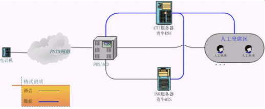 上圖是客服中心較常見(jiàn)的結(jié)構(gòu)圖,相當(dāng)于將初級(jí)客服的CT-Server服務(wù)器一分為三。原來(lái)的語(yǔ)音板卡由現(xiàn)在真正的PBX替代,青牛USE和青牛ATS則是從CT-Server軟件包中獨(dú)立出來(lái),強(qiáng)化各自的核心功能,運(yùn)行在兩臺(tái)單獨(dú)的服務(wù)器上(IVR服務(wù)器還是需要語(yǔ)音板卡來(lái)處理話路,但語(yǔ)音板卡已經(jīng)不負(fù)責(zé)PBX的交換功能了)。這種類(lèi)型的客服中心可以給客戶(hù)更大規(guī)模的、更穩(wěn)定的服務(wù),并且撥入電話的客戶(hù)感覺(jué)不到系統(tǒng)的變化。