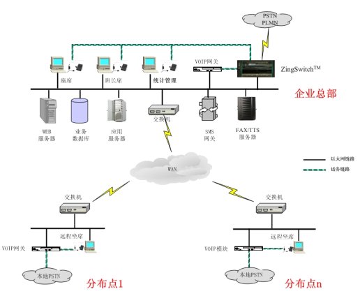 - 系統(tǒng)仍可同時在總部設(shè)立VoIP中心,用以實現(xiàn)數(shù)據(jù)和管理的集中,并且采用VoIP的方式,對各分布點的話務(wù)工作進行集中的監(jiān)控。