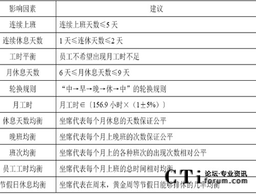要滿足每半小時實(shí)際安排的座席數(shù)量不少于需要的座席數(shù)量的要求,首先就需要進(jìn)行班次的設(shè)計(jì),這是為第五環(huán)節(jié)資源規(guī)劃而準(zhǔn)備的!鞍啻卧O(shè)計(jì)”是指設(shè)計(jì)出一系列的班次,比如早班,中班,晚班,等等。而將來只要告訴員工,你下個月每天各上什么樣的班次即可。在班次設(shè)計(jì)時,需要充分考慮前面提到的一些影響因素:如下所示。