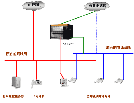 員工的電話有兩種選擇,一是傳統(tǒng)的模擬電話,以傳統(tǒng)的交換機(jī)布線方式,接普通的模擬電話線(雖然外表一樣,但它其實(shí)已經(jīng)是從Altiserv接出的網(wǎng)絡(luò)電話)。二是采用IP數(shù)字電話,以網(wǎng)線方式插入局域網(wǎng)的端口或集線器。在辦公室內(nèi)使用IP數(shù)字電話和普通模擬電話沒(méi)有多大的區(qū)別;兩種電話還可以在一個(gè)Altiserv下同時(shí)使用。