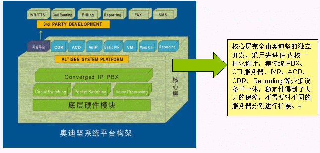 交換功能作為整個系統(tǒng)的核心功能,是系統(tǒng)一切功能的基礎(chǔ)。奧迪堅高度一體化通訊服務(wù)器AltiServ,采用先進(jìn)的DSP等技術(shù),將傳統(tǒng)的語音交換和IP包交換在系統(tǒng)底層實(shí)現(xiàn),使系統(tǒng)的技術(shù)水平、功能及穩(wěn)定性達(dá)到了一個新的高度,可以實(shí)現(xiàn)大容量電話的呼入/呼出處理、電話轉(zhuǎn)接、支持PRI、E1、中國一號信令、七號信令、模擬線路等多種接入方式,同時還具備傳統(tǒng)PBX所不具備的強(qiáng)大的語音信箱、電話會議功能、VoIP、界面友好的系統(tǒng)管理功能等。由于在底層對VoIP支持,所以既可以使用普通電話機(jī),也可以使用IP話機(jī)或者軟電話登陸到系統(tǒng),豐富了用戶的選擇的范圍,方便了用戶使用并節(jié)省投資,并且VoIP技術(shù)擴(kuò)展了增值空間,可以用IP座席輕松構(gòu)建遠(yuǎn)程專家座席,更加適合互聯(lián)網(wǎng)時代的應(yīng)用。