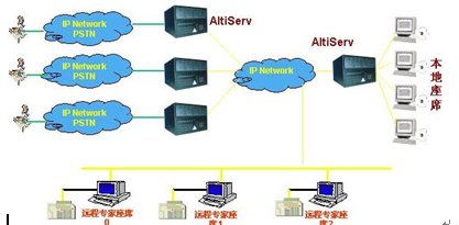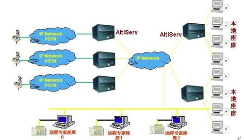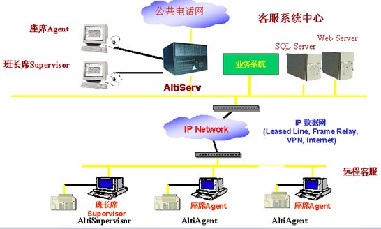 這種組合節(jié)省管理成本,因?yàn)樗械淖瘑T都在一點(diǎn),便于管理控制,同時(shí)用戶只要撥打本地電話即可進(jìn)入系統(tǒng)接收服務(wù),如需人工座席應(yīng)答的話系統(tǒng)會(huì)自動(dòng)將來電通過Internet轉(zhuǎn)接到座席員處,對(duì)公司的話費(fèi)成本也較低(都是通過Internet實(shí)現(xiàn)的長途轉(zhuǎn)接功能)。同時(shí)AltiGen也支持通過IP分機(jī)的方式遠(yuǎn)程登錄到系統(tǒng)實(shí)現(xiàn)遠(yuǎn)程座席的功能,這樣對(duì)有些高級(jí)話務(wù)員或?qū)<易,不必每天到公司上班,可以通過家里的電腦登錄到AltiGen系統(tǒng),作為系統(tǒng)的一個(gè)分機(jī)來完成所有的座席員的功能,在他的電腦屏幕上也能彈出來電人的信息。系統(tǒng)的組網(wǎng)圖如下: