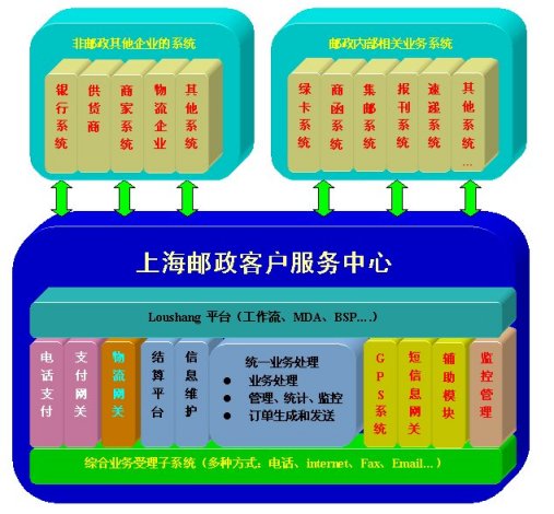 作為上海郵政客戶服務(wù)中心系統(tǒng),由綜合業(yè)務(wù)受理、統(tǒng)一業(yè)務(wù)處理、多種支付手段、統(tǒng)一物流接口以及多種輔助功能等多個(gè)子系統(tǒng)組成,在設(shè)計(jì)中必須要整體考慮其各子系統(tǒng)之間有機(jī)結(jié)合,以及與其他業(yè)務(wù)系統(tǒng)的信息處理接口。