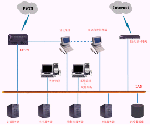 LTD4000客戶服務中心主要由LTD-09可編程智能語音交換機、業(yè)務代表座席、CTI服務器、數據庫服務器、WEB服務器、管理監(jiān)控工作站和網絡連接設備等部分組成。