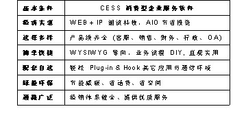 CESS消費(fèi)型服務(wù)軟件具有經(jīng)濟(jì)實(shí)惠、選擇多樣、簡(jiǎn)單快捷、配套自選、綠能環(huán)通路廣泛等特點(diǎn),采用Web+IP的潮流科技,AIO節(jié)省投資,使軟件經(jīng)濟(jì)實(shí)惠;CESS軟件產(chǎn)品線齊全,涵蓋客服、銷售、財(cái)務(wù)、行政、OA等很多方面,給您多樣選擇;WYSIWYG(所見(jiàn)即所得)導(dǎo)向,業(yè)務(wù)流程DIY,讓您至需要?jiǎng)觿?dòng)鼠標(biāo)就可以DIY您想要得到的設(shè)計(jì),不再需要麻煩IT人員,只管實(shí)用,簡(jiǎn)單快捷;輕松Plug-in & Hook其它應(yīng)用與通信環(huán)境,可根據(jù)您的需要配套自選;節(jié)能減碳、省話費(fèi)、省空間,綠色環(huán)保;經(jīng)銷體系健全、提供優(yōu)質(zhì)服務(wù),通路廣泛。