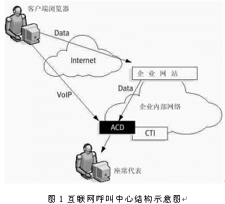 互聯(lián)網(wǎng)呼叫中心是在互聯(lián)網(wǎng)技術(shù)飛速發(fā)展的基礎(chǔ)上所產(chǎn)生的。對(duì)于客戶而言,完全的互聯(lián)網(wǎng)呼叫中心和傳統(tǒng)呼叫中心最大的區(qū)別就在于客戶無(wú)需電話,只要從一個(gè)Web站點(diǎn)就可以直接進(jìn)入互聯(lián)網(wǎng)呼叫中心。這樣一來(lái),呼叫中心就從傳統(tǒng)形式上的“撥號(hào)-交談(Dial to Talk)”發(fā)展到現(xiàn)代形式的“點(diǎn)擊-交談(Click to Talk)”。典型的互聯(lián)網(wǎng)呼叫中心結(jié)構(gòu)如圖1所示。