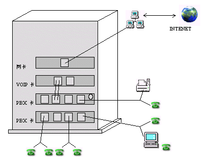 圖中假設(shè)客戶安裝了兩塊PBX板卡和一塊VOIP板卡,產(chǎn)品的板卡都插在計(jì)算機(jī)主板上的插槽上。系統(tǒng)的布線如圖所示,PBX板卡上有外線端口和分機(jī)端口(ISA型號(hào)的每個(gè)插口接4條線、PCI型號(hào)的每個(gè)插口接2條線),外線接在外線端口上,分機(jī)線接在分機(jī)端口上。VOIP板卡有2個(gè)插口,每個(gè)插口接2條線。用戶如果要使用VOIP功能,需要從分機(jī)端口接出線到VOIP端口中?蛻羰褂镁W(wǎng)絡(luò)電話時(shí),只要呼叫連接VOIP端口的分機(jī)號(hào)碼即可撥通網(wǎng)絡(luò)電話。