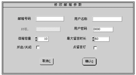 4). 主人密碼:信箱主人訪問自己信箱的口令。主人可以通過訪問自已的信箱修改密碼,若主人忘記密碼可通過管理員將其設(shè)置為缺省值0000。