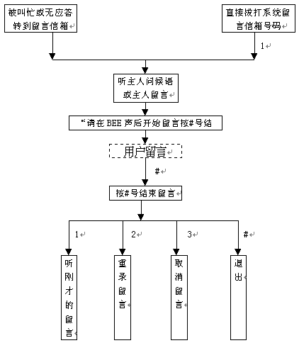 3). 若輸入的分機(jī)信箱號(hào)碼正確,此時(shí)系統(tǒng)會(huì)提示用戶"留言請(qǐng)按1,主人訪問請(qǐng)按2",按1后即可給該信箱留言。