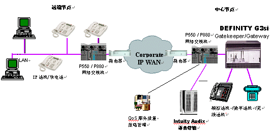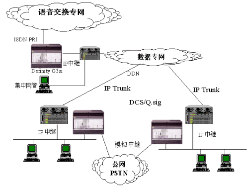 隨著IP網(wǎng)絡(luò)技術(shù)的不斷發(fā)展,數(shù)據(jù)網(wǎng)絡(luò)的融合能力越來越強。AVAYA在全球范圍內(nèi)率先推出全面符合H.323標準的VoIP解決方案及基于IP中繼的DCS/Q.sig專網(wǎng)透明功能信令。通過IP中繼將公司全部分支包括機構(gòu)的DEFINITY交換機進行連接,同樣可以提供全面的專網(wǎng)透明功能和網(wǎng)絡(luò)呼叫中心應(yīng)用,DEFINITY IP中繼可提供豐富的語音壓縮能力,從64Kbps的無壓縮傳輸?shù)?Kbps的經(jīng)濟傳輸方案均可提供,同時通過復(fù)用在IP包中的DCS/Q.sig信令提供透明功能。